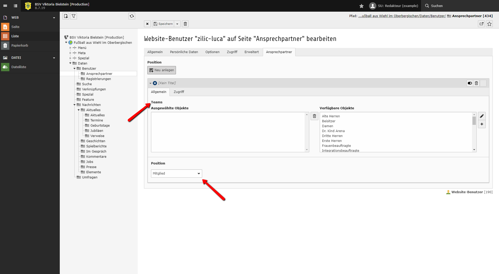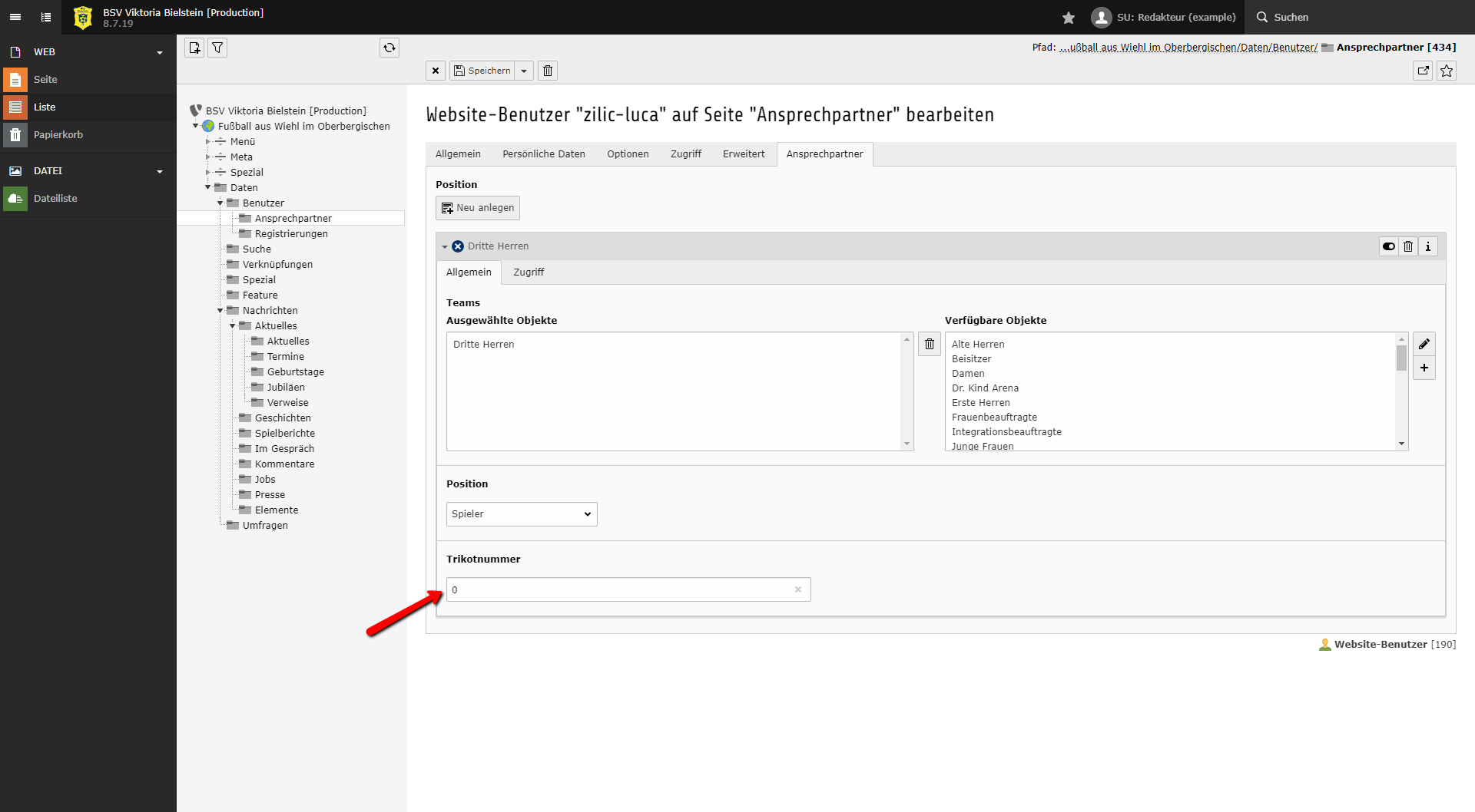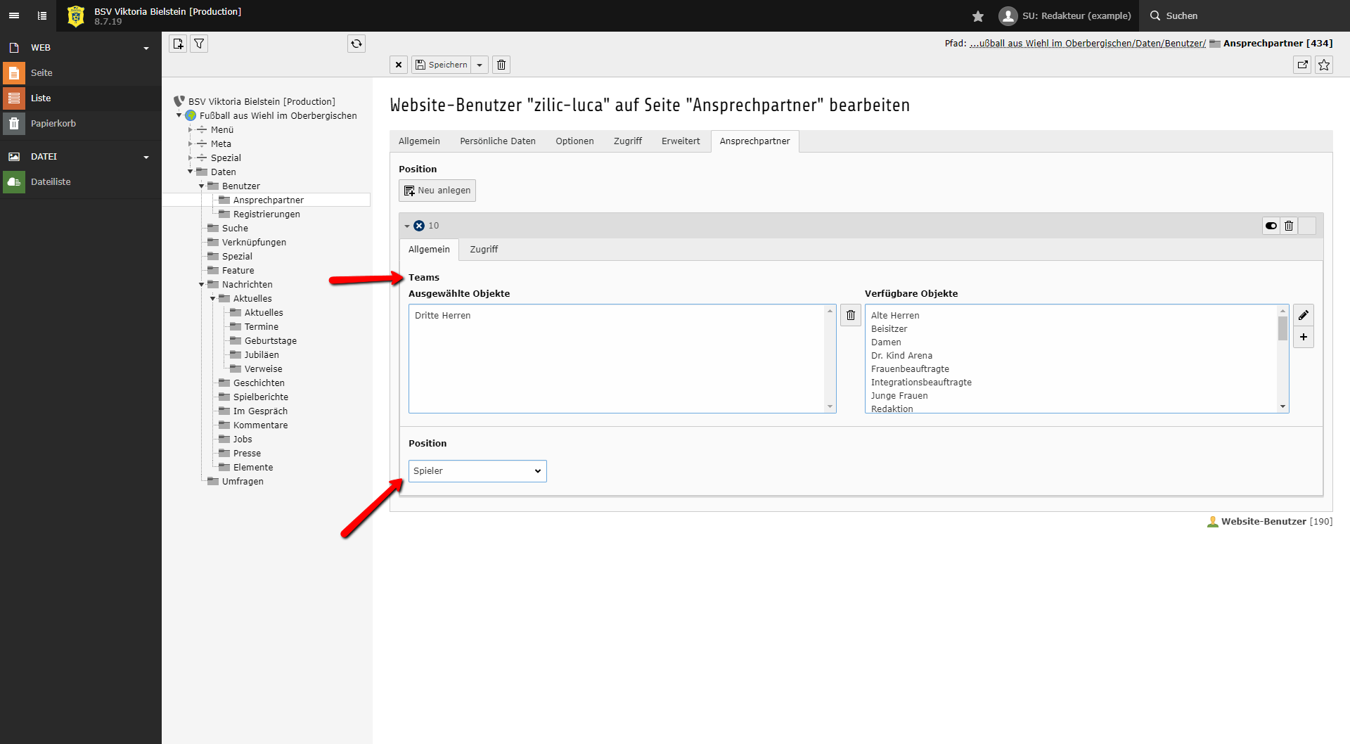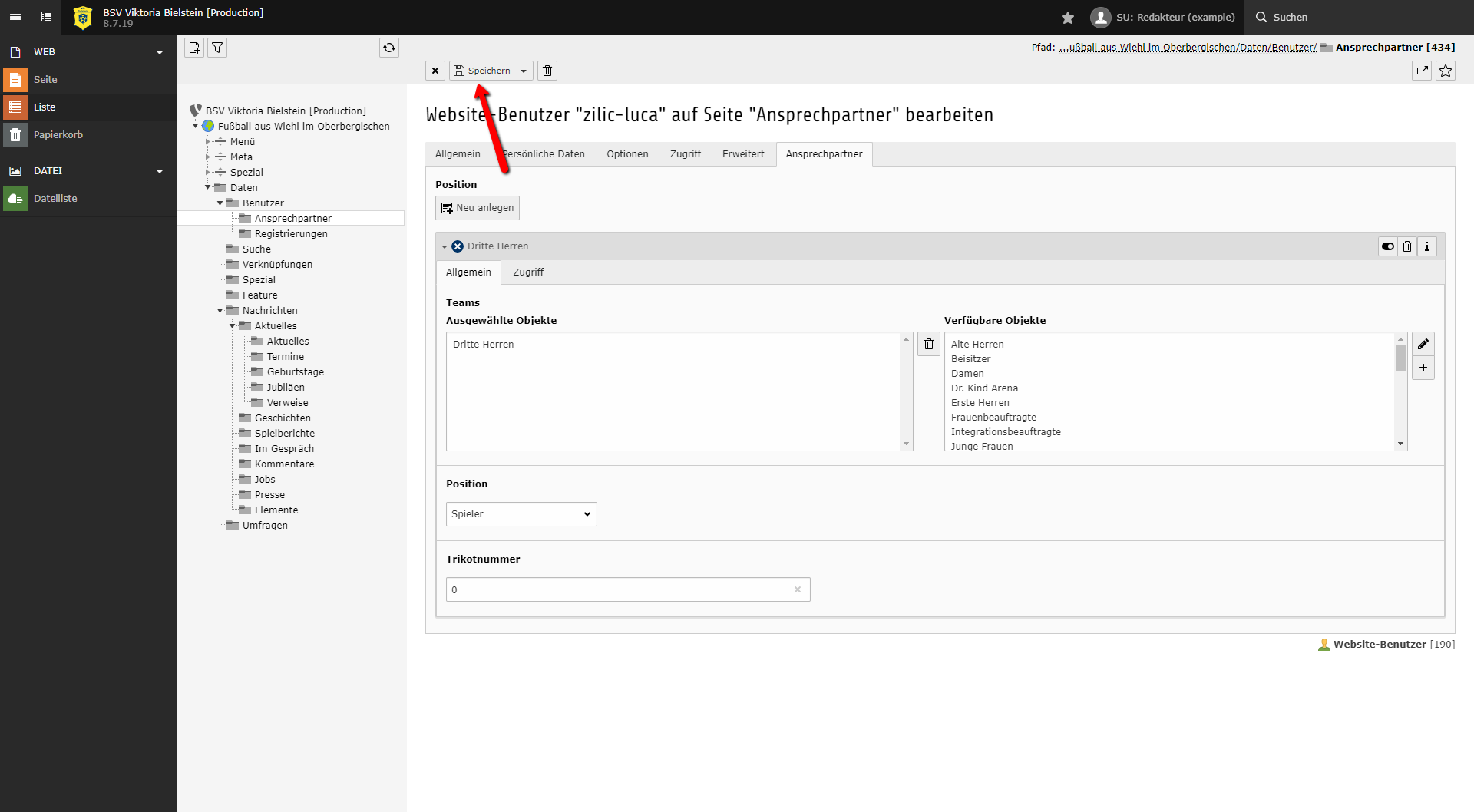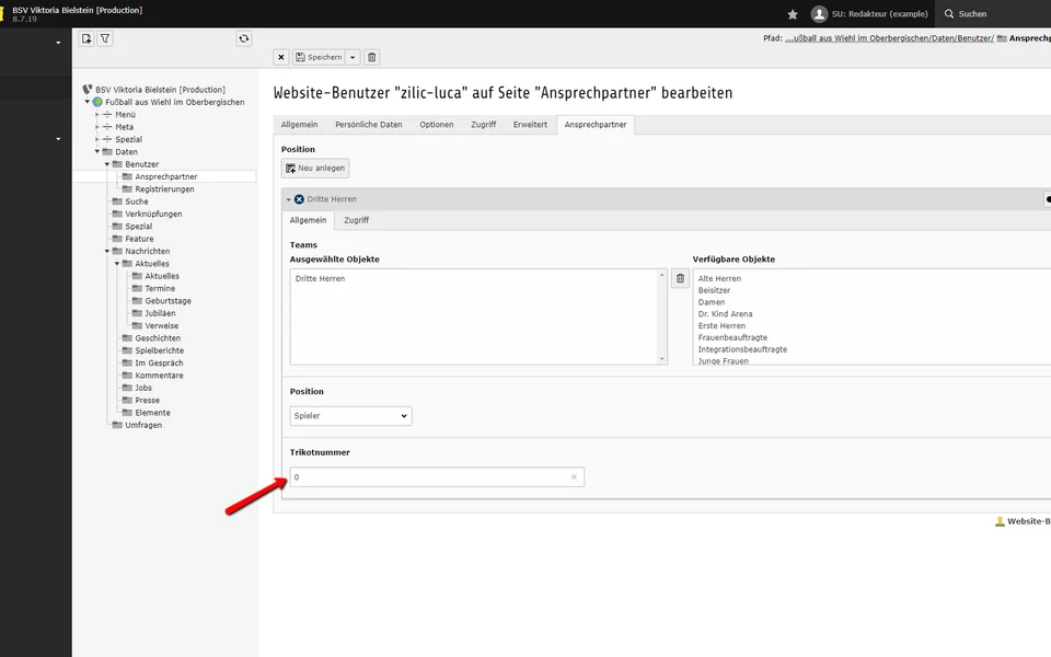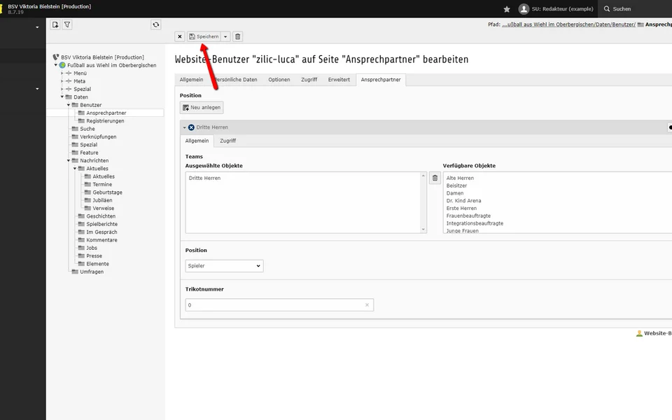 Im Beispiel ist Luka Zilic ein Spieler der Dritten Herren. Dazu weist du dem Ansprechpartner das Team Dritte Herren und die Position Spieler hinzu.