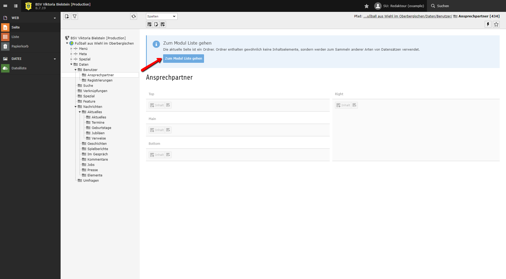 Navigiere im Anschluss zum Ordner Ansprechpartner (ID: 434), in dem die Ansprechpartner gepflegt werden.