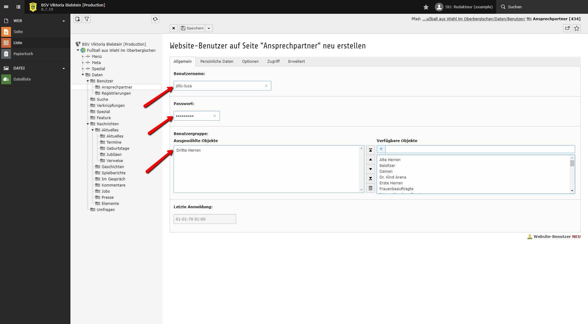 Im Beispiel legen wir den Ansprechpartner Luca Zilic an, dem wir den Benutzernamen zilic-luca sowie die Benutzergruppe Dritte Herren zuweisen.