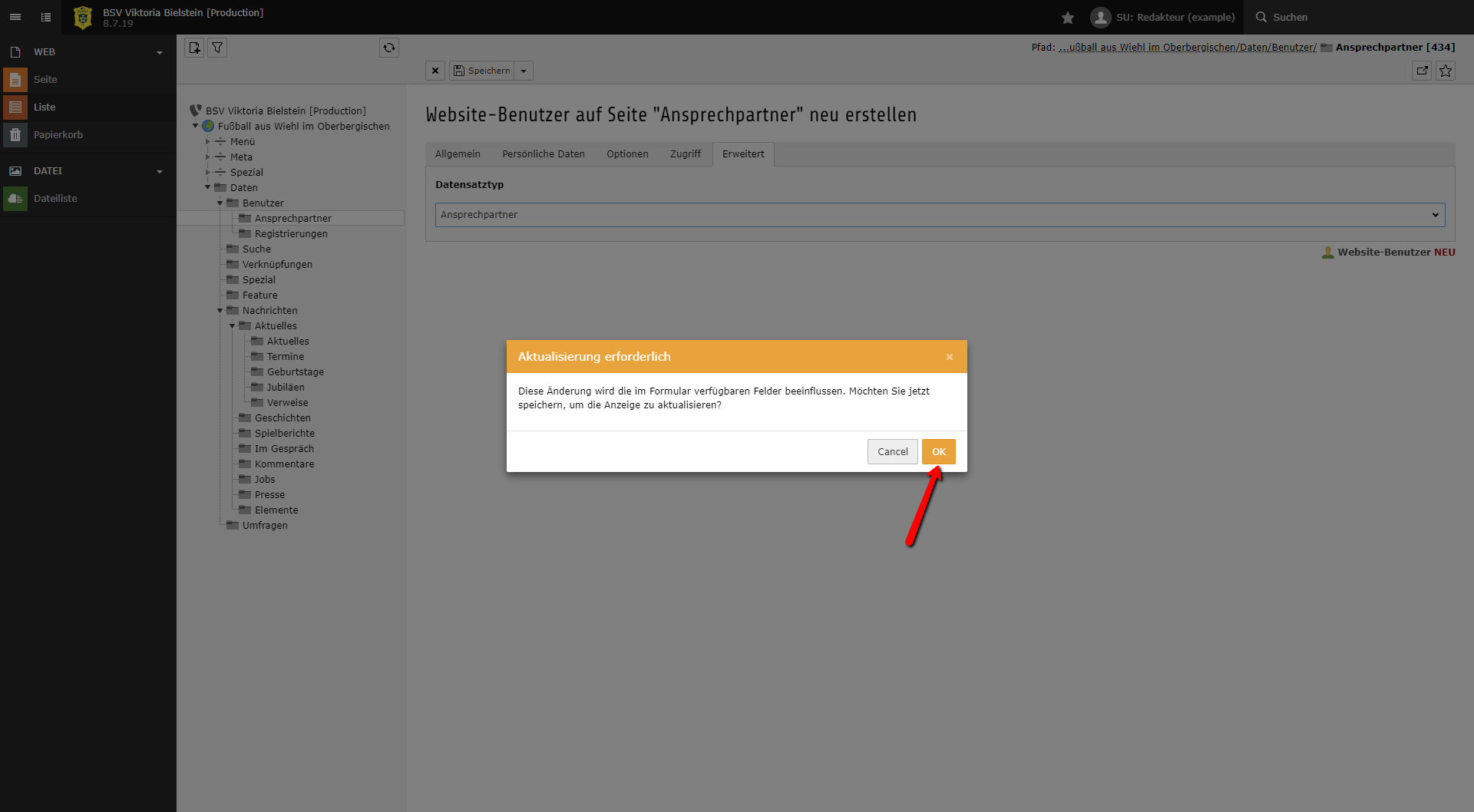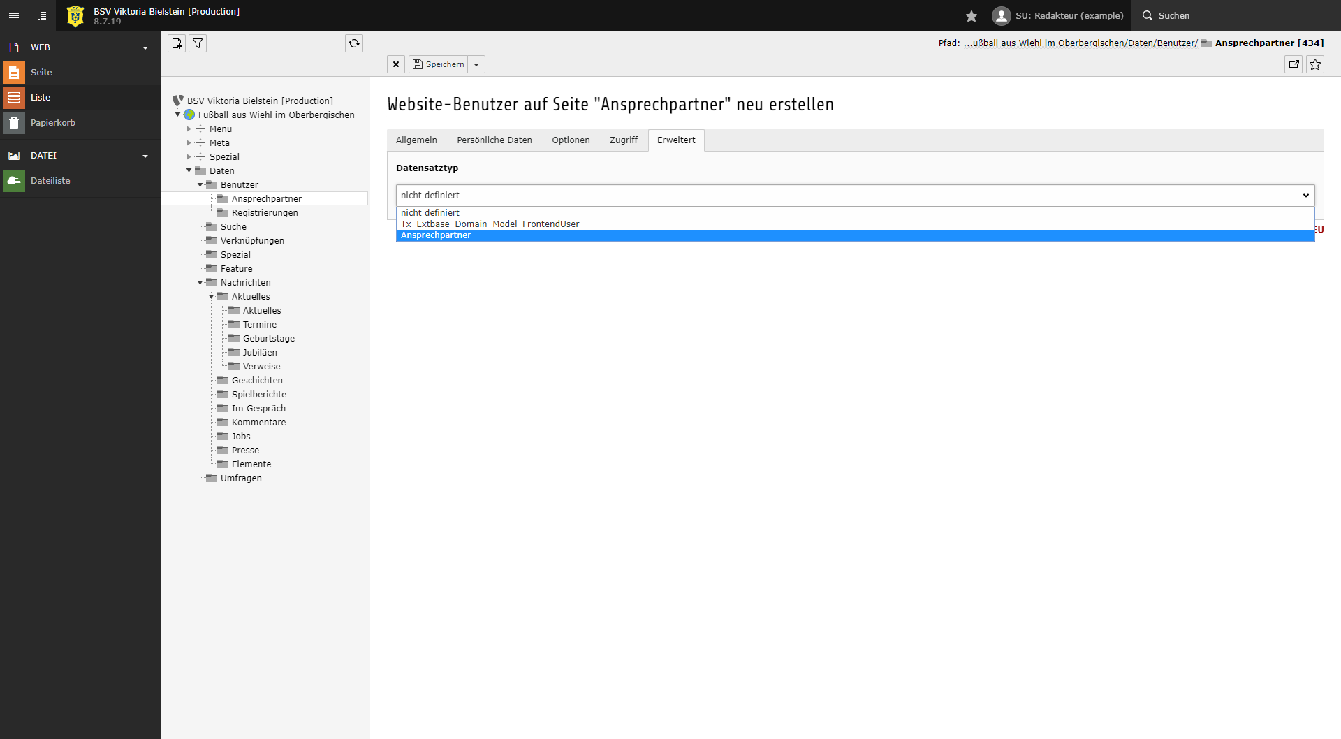 Im letzten Schritt muss noch die genaue Position des Ansprechpartners definiert werden. Wähle dazu unter dem Reiter Erweitert den Datensatztyp Ansprechpartner aus.