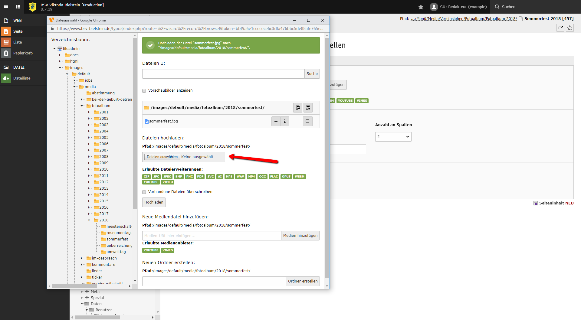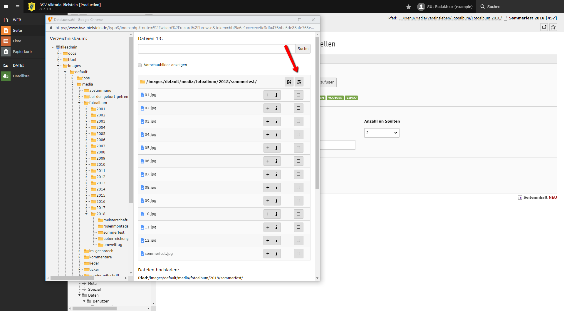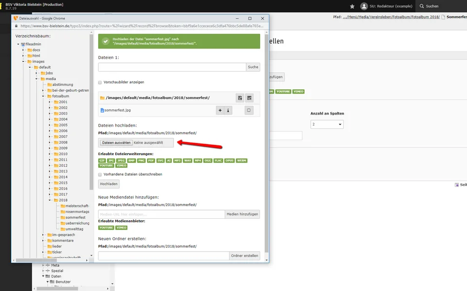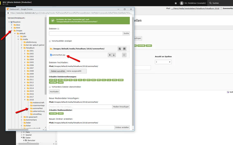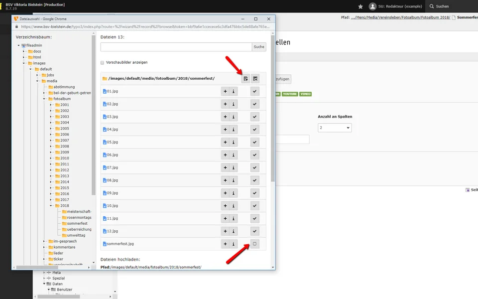 Zunächst müssen Medienelemente zum Inhaltselement hinzugefügt werden. Klicke dazu auf Medienelement hinzufügen, im Anschluss öffnet sich der Elemente-Browser. Nachdem du zum richtigen Ordner (sommerfest) navigiert bist, siehst du, dass bereits ein Bild in diesem Ordner liegt. Dabei handelt es sich um das Bild, das in den Seiteneigenschaften unter Ressourcen verknüpft wird.
