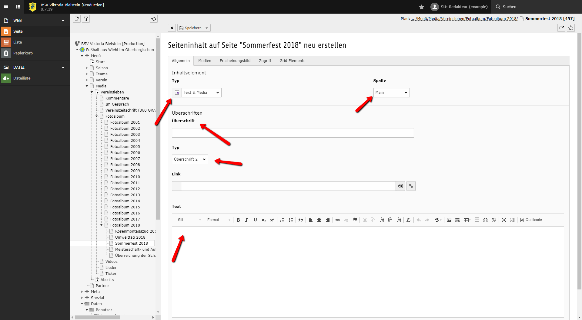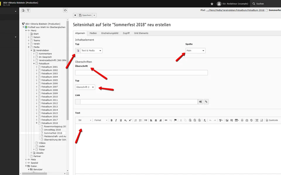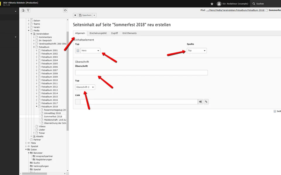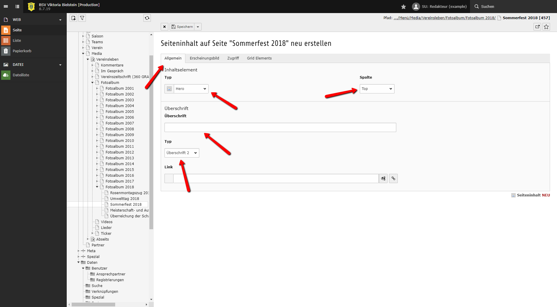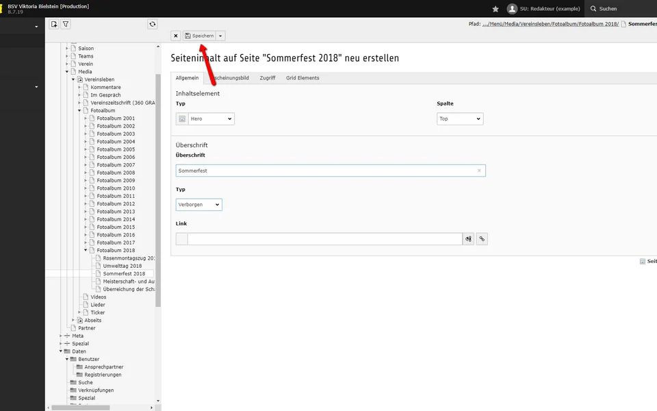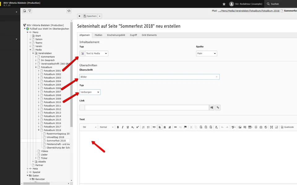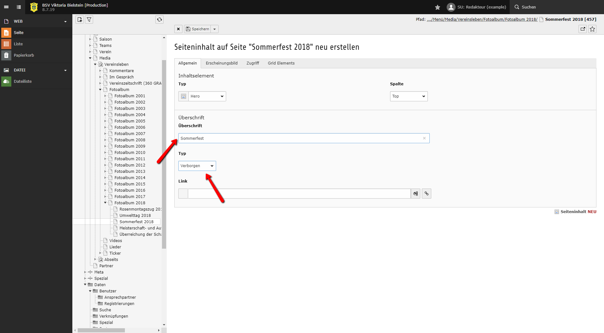 Im Beispiel gibst du eine aussagekräftige Überschrift (Sommerfest) an, um die Übersichtlichkeit im Backend zu gewährleisten. Gleichzeitig setzt du den Typ der Überschrift aber auf verborgen, um zu verhindern, dass die Überschrift auf der Internetseite ausgegeben wird.