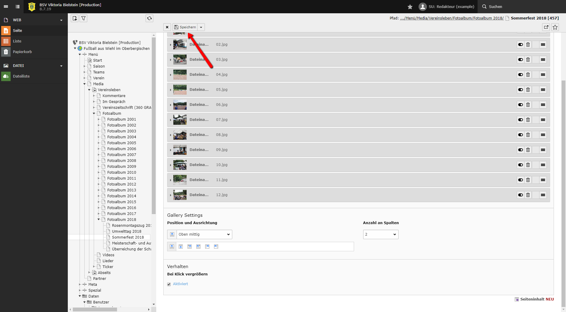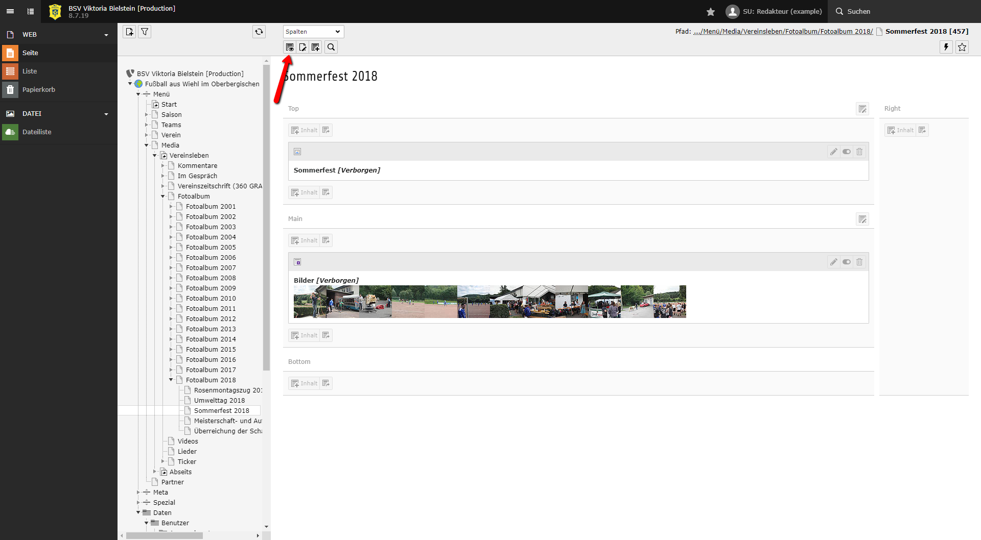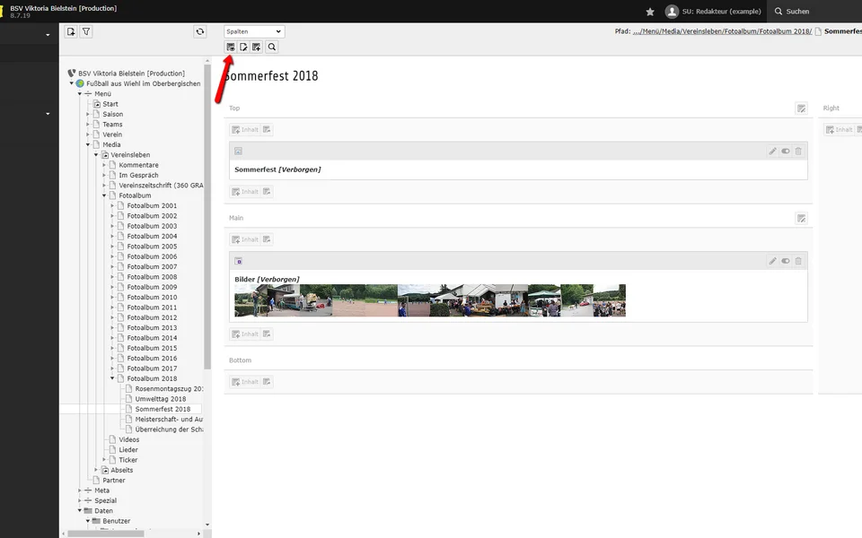 Nachdem das Inhaltselement geschlossen wurde, siehst du das Inhaltselement in der Spalte Main liegen. Über den Button Vorschau ansehen kannst du dir das Fotoalbum auf der Internetseite angucken.