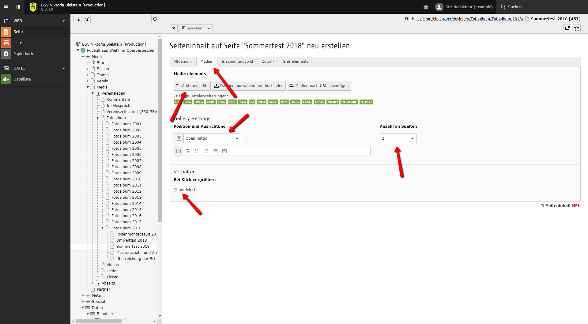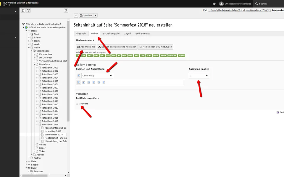 Im Anschluss wechselst du in den Reiter Medien. Dort kannst du Medienelemente hinzufügen und Einstellungen zur Ausrichtung, der Anzahl an Spalten und dem Verhalten bei Öffnung treffen.