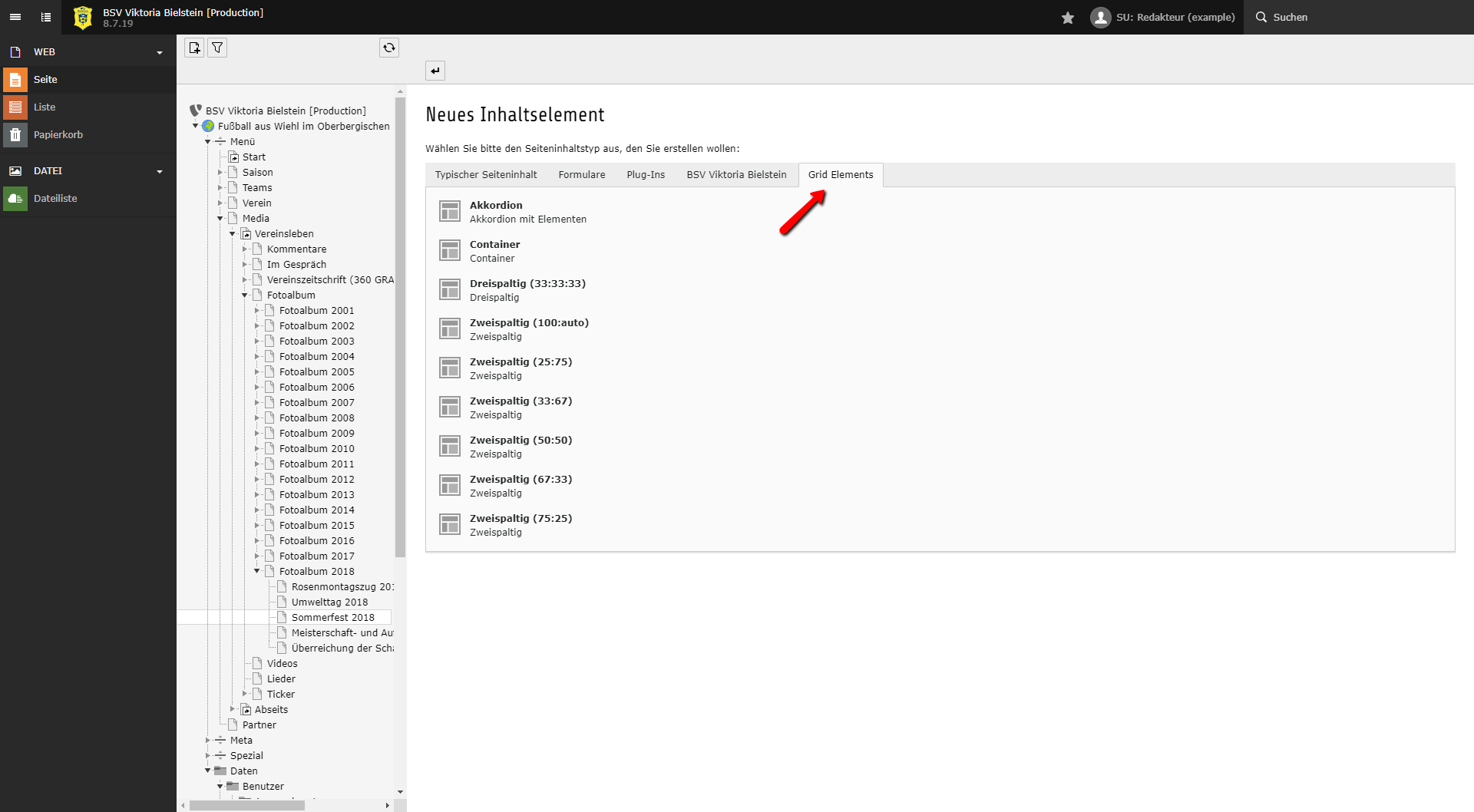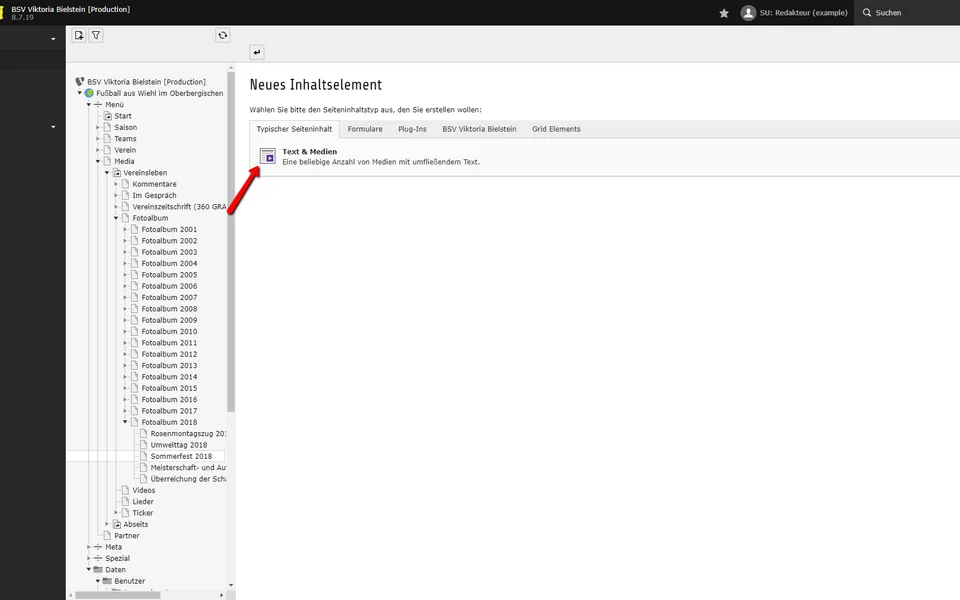 Im Beispiel fehlen nun nur noch die Bilder des Fotoalbums. Diese werden in der Spalte Main eingepflegt. Wenn du auf den bereits dir bekannten Button + Inhalt klickst, siehst du bereits, dass dir viel mehr Inhaltselemente zur Verfügung stehen als in der Spalte Top. Neben dem Inhaltselement Text & Medien, das später für die Bilder genutzt wird, gibt es dort zahlreiche weitere Inhaltselemente.