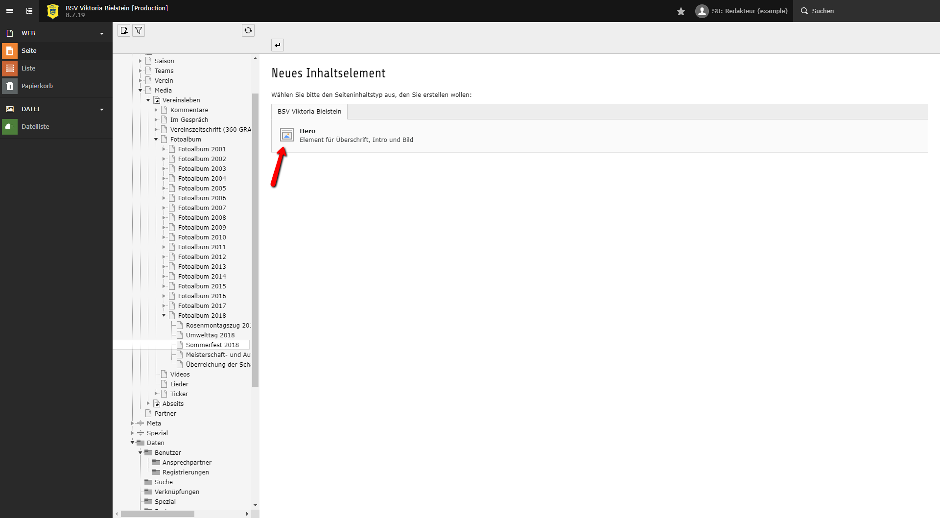 Beginne mit dem Inhaltselement, das in der Spalte Top erscheinen soll, und klicke dazu auf den Button + Inhalt in der Spalte Top. Du siehst das Inhaltselement Hero. Zur Erklärung: Das System bietet eigentlich eine enorme Anzahl an Inhaltselementen. Allerdings wurde es von uns so konfiguriert, dass du in der jeweiligen Spalte nur das Inhaltselement hinzufügen kannst, das in das Konzept der Internetseite passt. In dieser Spalte ist im Konzept nur das Inhaltselement Hero erlaubt, weshalb dir auch nur dieses Element angezeigt wird. Klicke auf den Namen, um das Inhaltselement Hero zu erstellen.