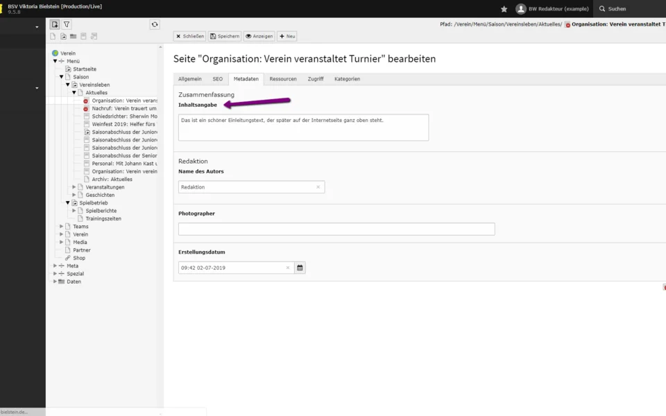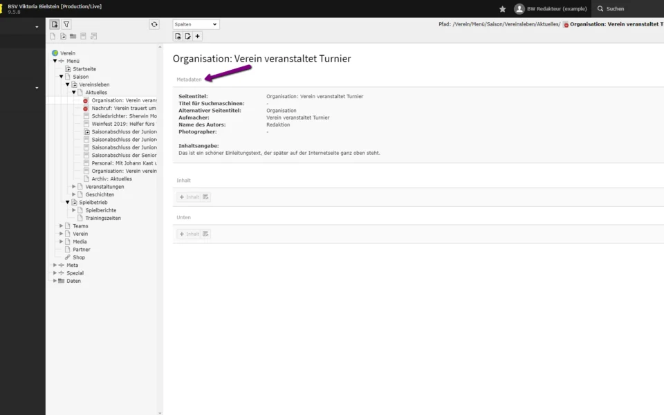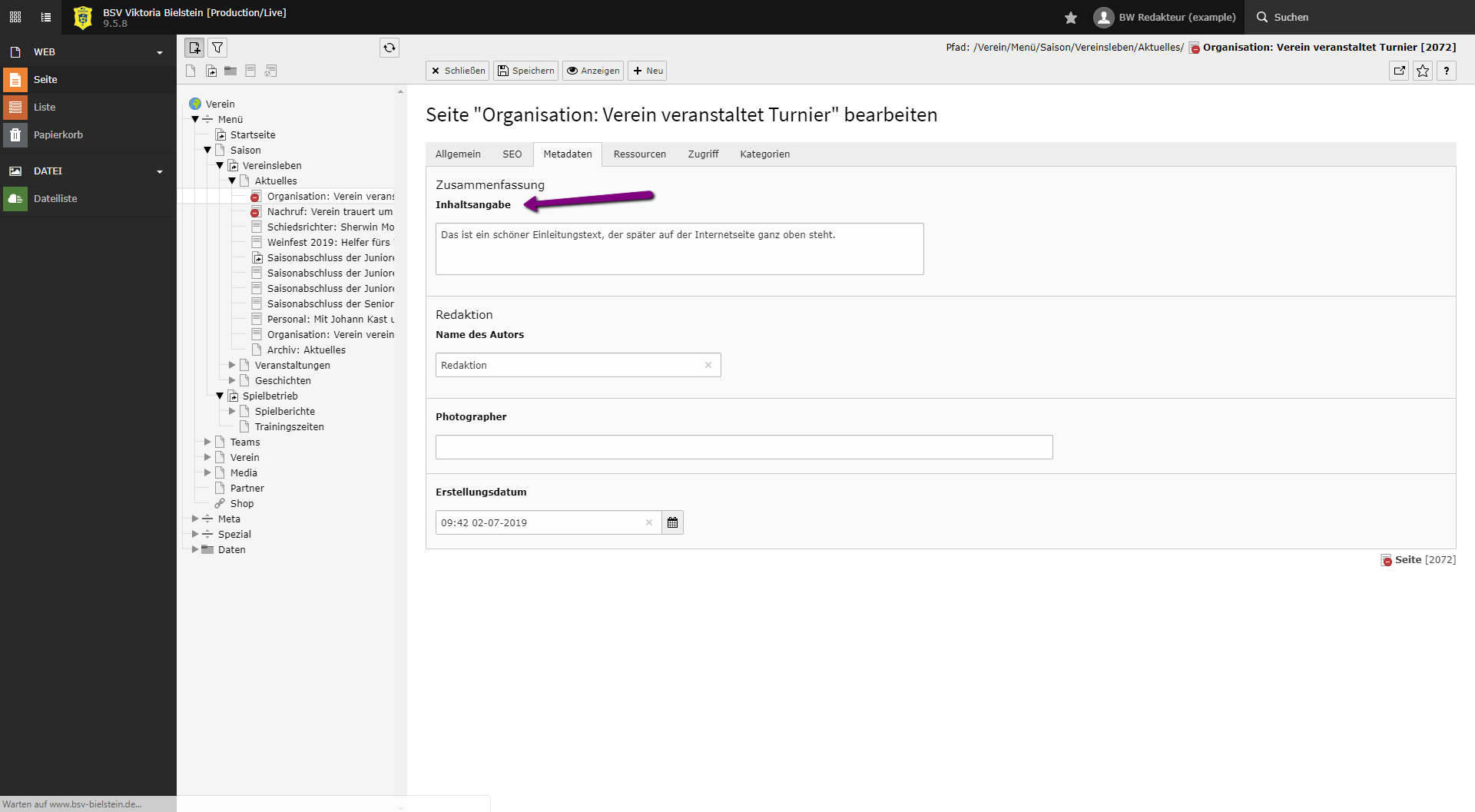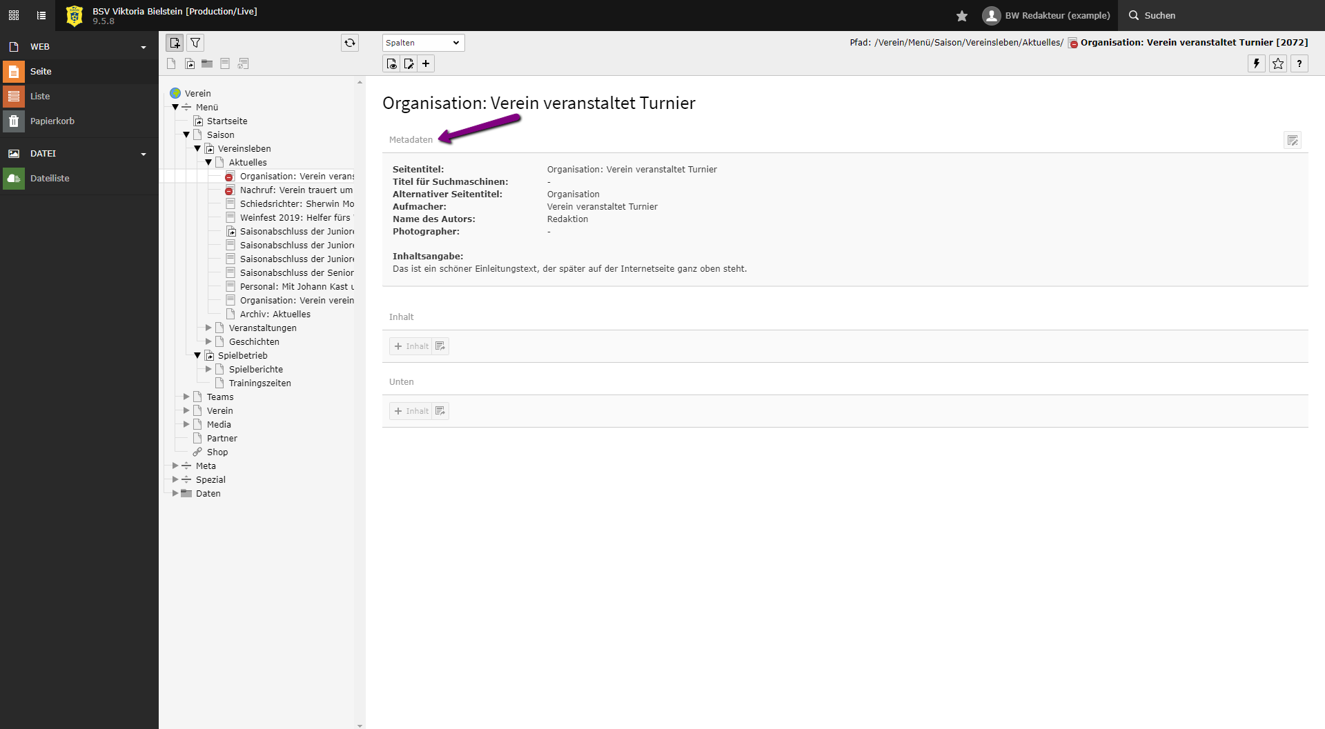Daneben kannst du im Reiter Metadaten auch den Autor, die E-Mail des Autors sowie das Datum des Beitrags pflegen. Diese Daten werden in den Übersichtsseiten ausgespielt.