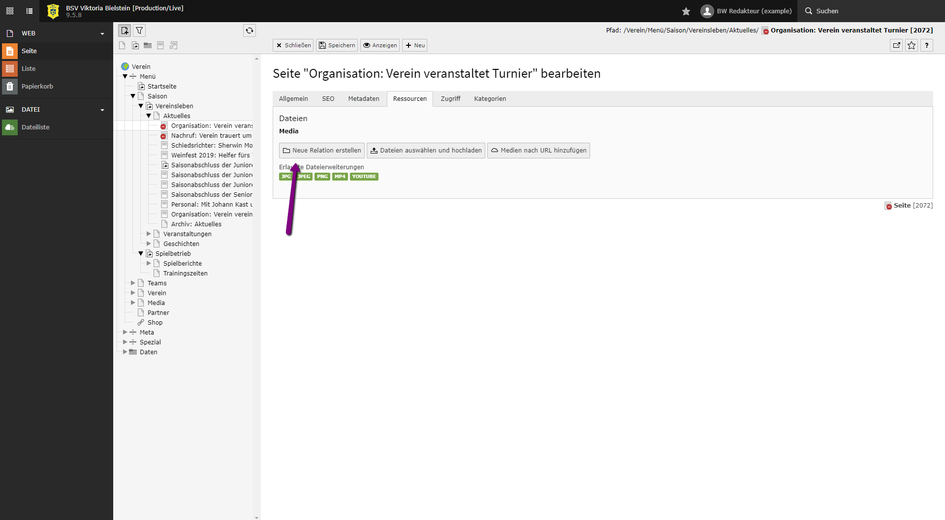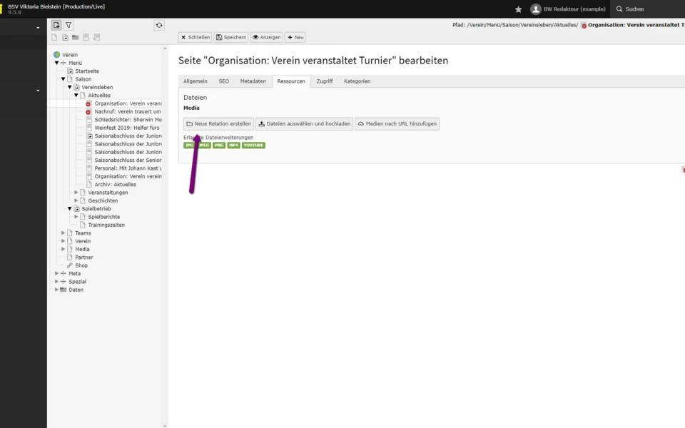 Im Reiter Ressourcen hast du die Möglichkeit, das Bild der Nachricht zu bearbeiten. Um ein neues Bild hinzufügen zu können, musst du auf den Button Neue Relation erstellen klicken. Das Verfahren ist dann das gleiche wie bei normalen Seiten.
