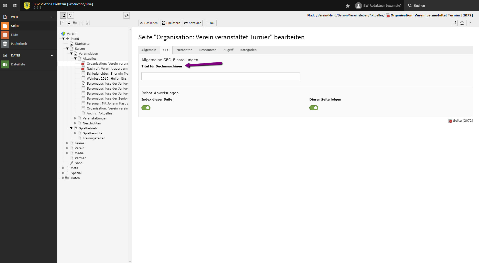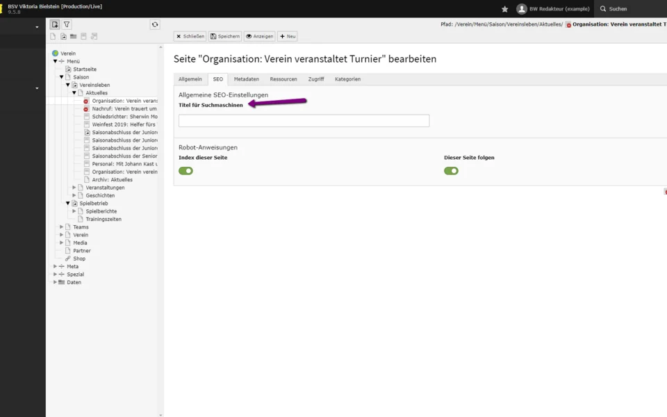Im Reiter SEO hast du die Möglichkeit, den Titel für Suchmaschinen zu bearbeiten und darüber zu entscheiden, ob die Nachricht von Suchmaschinen indexiert werden soll oder nicht.
