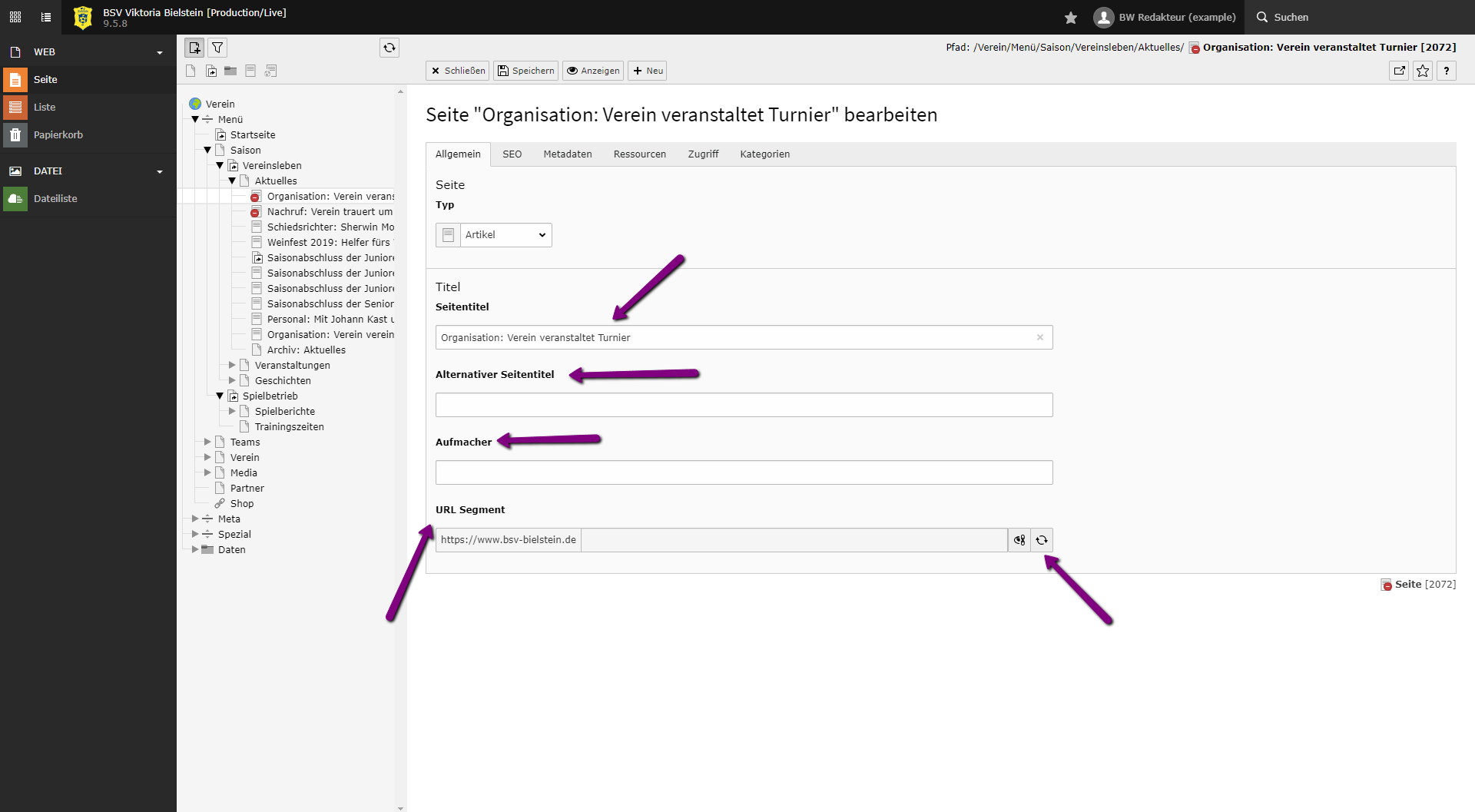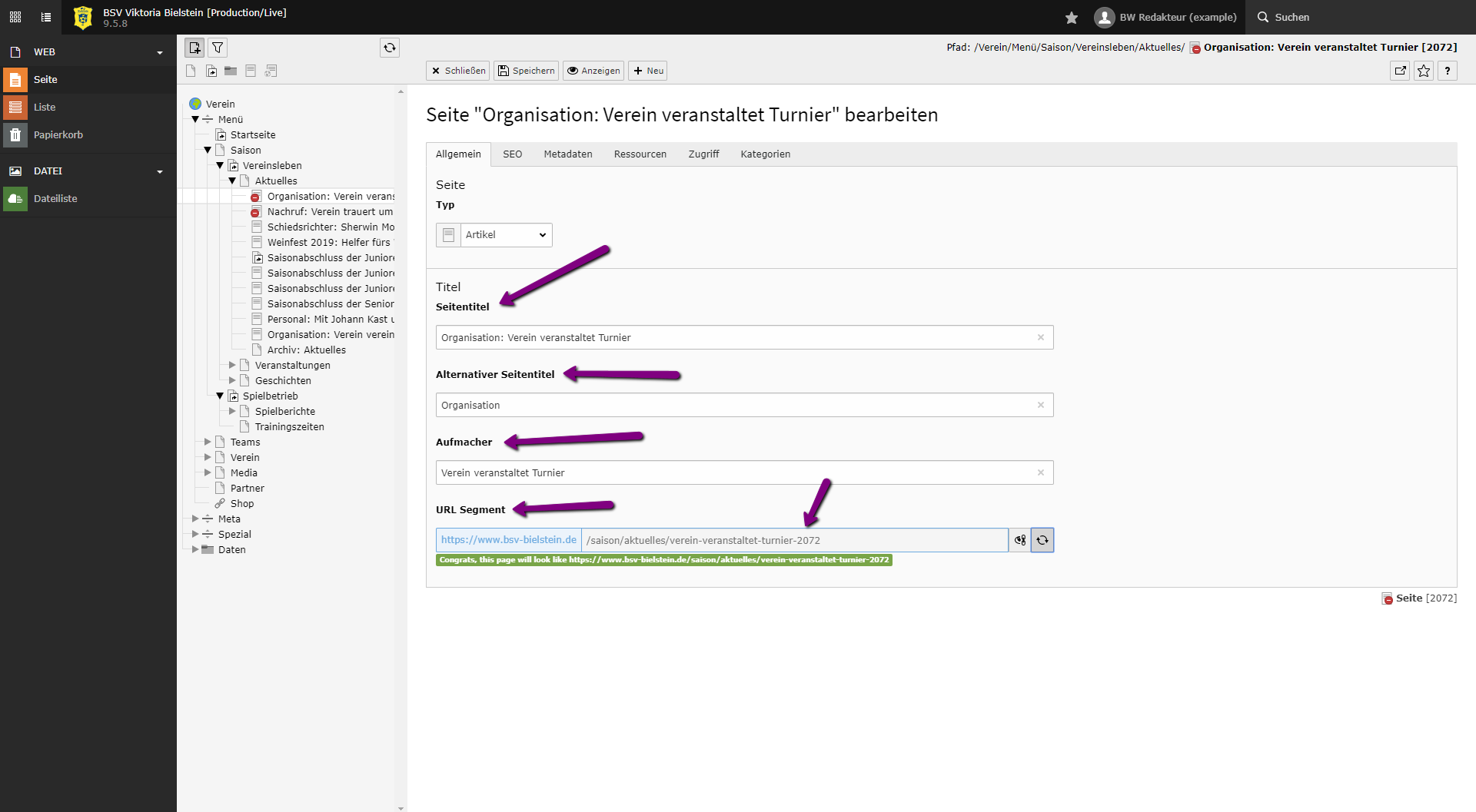 Im Reiter Allgemein hast du die Möglichkeit, die Titel der Nachricht zu bearbeiten. Der Seitentitel ist der Titel, der später in der tatsächlichen Nachricht und in den Suchmaschinen zu sehen ist. Der alternative Navigationstitel ersetzt den Seitentitel in den Dachzeilen. Als Aufmacher verwendest du am besten plakative Überschriften, die den Inhalt der Nachricht in wenigen Worten zusammenfassen.