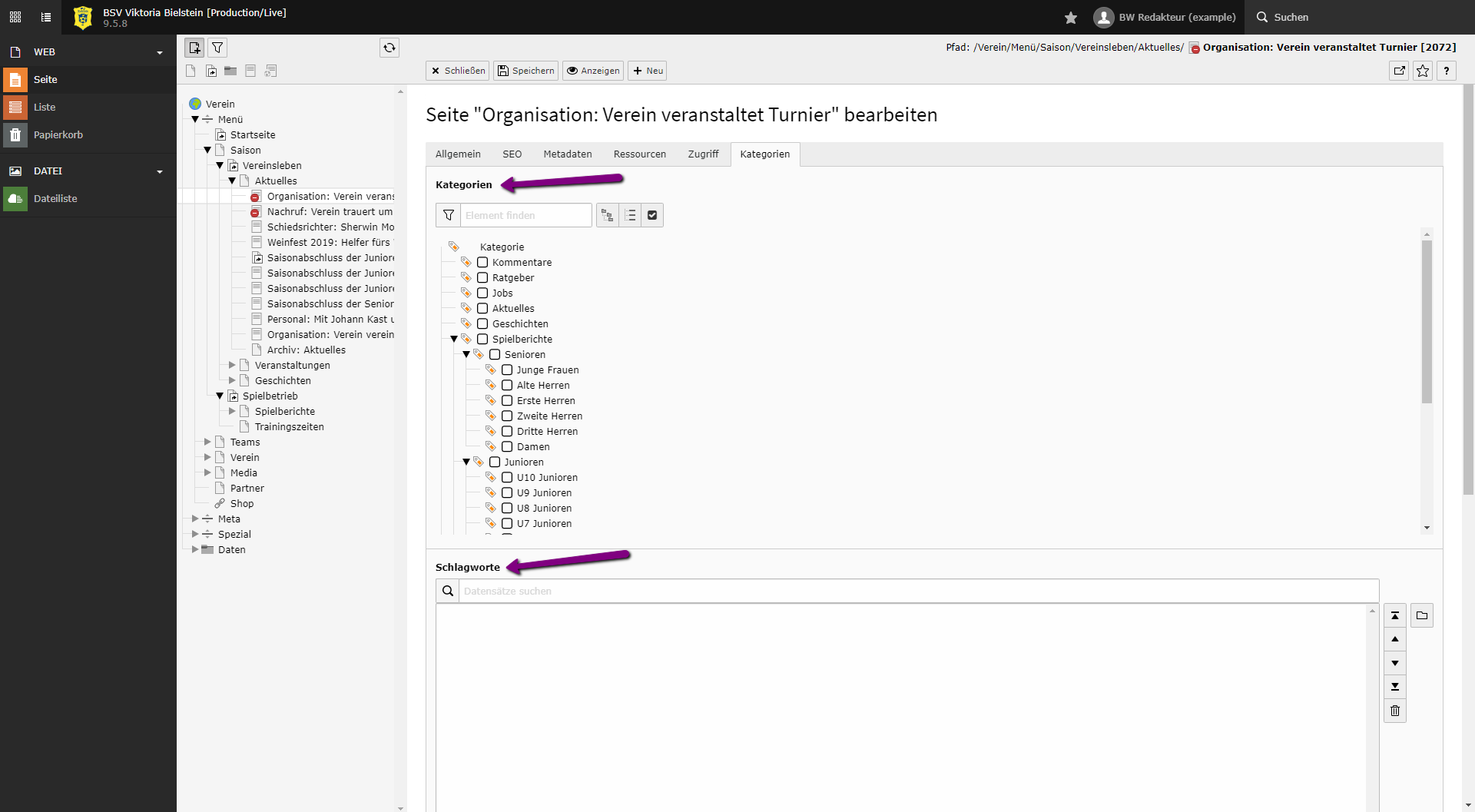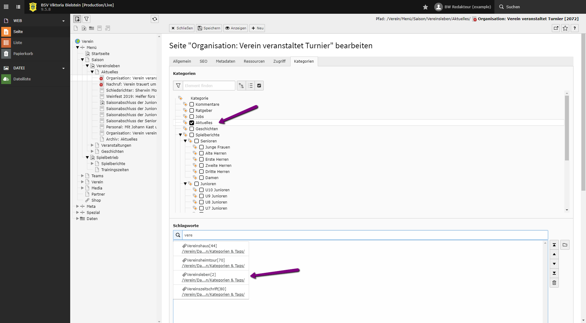 Im Beispiel möchten wir die Kategorie Aktuelles und den Tag Vereinsleben pflegen. Für die Pflege der Tags reicht es, den gewünschten Tag in das Suchfeld einzugeben. Im Anschluss bekommen wir Tags, die zu unserer Suche passen, automatisch vorgeschlagen.
